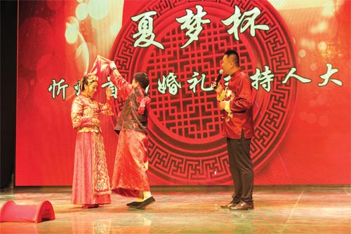 李忠憲參加忻州首屆婚禮主持人大賽的作品是《地域風(fēng)情(民俗·佛樂)》。他介紹作品時說:“當(dāng)我得知自己進(jìn)入決賽時,我突然想起今年《人說山西好風(fēng)光》山西旅游發(fā)展大會上我市領(lǐng)導(dǎo)的講話,講話樸實(shí)誠懇,讓我印象深刻。決定了這個方案后,我找到當(dāng)時的視頻,一字一句把領(lǐng)導(dǎo)的講話寫了下來。按照這個思路我展開了想象(五臺圣境·雁門雄風(fēng)·蘆芽美景·黃河風(fēng)情),想到山西的母親河,汾河源頭寧武與八音之鄉(xiāng)定襄,當(dāng)住在汾河源頭的小伙遇到聽著民樂長大的姑娘時,小伙的心融化了,為了得到定襄姑娘的芳心,小伙下決心學(xué)會了吹嗩吶,就這樣你來我往,情定今生。因?yàn)樵趥鹘y(tǒng)婚禮中有交杯酒之類的儀式,所以在這個環(huán)節(jié)我選擇了將汾河源頭的福水,與充盈著定襄鍛造神韻并感染了佛國靈性的貫流之水合二為一,最后我想到了五臺山,有了佛光普照,為新人祈福,為蒼生庇佑的想法,于是出現(xiàn)了新人手持蓮花寶燈,全場嘉賓雙手合十,祈福庇佑的場景?!?/p>