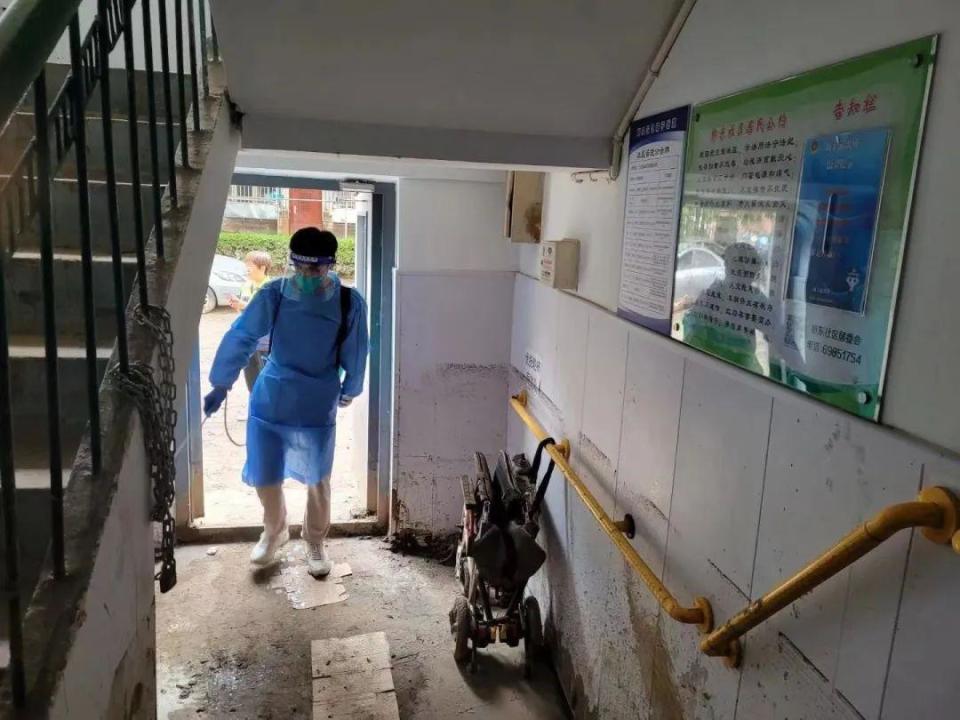 “益行志愿服務(wù)隊從8月4日17點下班后開始組織救災(zāi)工作,到凌晨24點充分準(zhǔn)備完畢??傆嫵鰟?輛汽車,志愿者們對社區(qū)內(nèi)的一樓單元門口、垃圾分類驛站、居民家里、黨群活動中心、居委會物資庫、社區(qū)花園內(nèi)和道路,開展清理淤泥和清洗路面工作。”張偉麗介紹道。