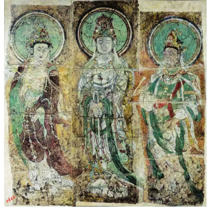 在中國(guó)廳中央墻上有幾十平方米的敦煌壁畫,其割痕雖猶可見(jiàn),卻難掩其久遠(yuǎn)的鮮麗及三位“濃麗豐肥”菩薩的雍容華貴。