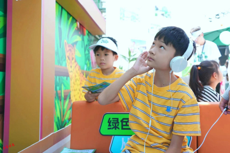 “有啄木鳥、有青蛙,剩下的我聽不出來……”在“萬物有聲”游戲環(huán)節(jié),小朋友認(rèn)真地和環(huán)保志愿者說。在這個環(huán)節(jié),參與者佩戴耳機后,可以根據(jù)聽到的聲音猜動物的名稱。各種動物的聲音,著實吸引了不少小朋友的參與,有的小朋友還模仿發(fā)出聲音的動物形象,惟妙惟肖,讓現(xiàn)場不少人笑出聲來。