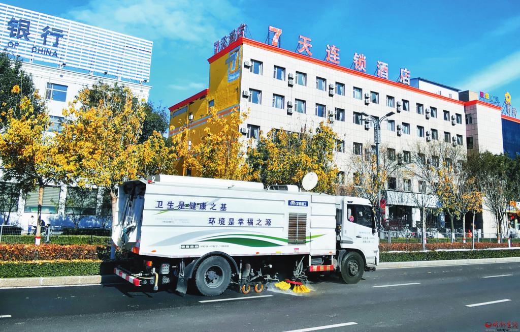 11月10日,高效的環(huán)衛(wèi)洗掃車(chē)正在對(duì)路面進(jìn)行清洗作業(yè)。 (張存良攝