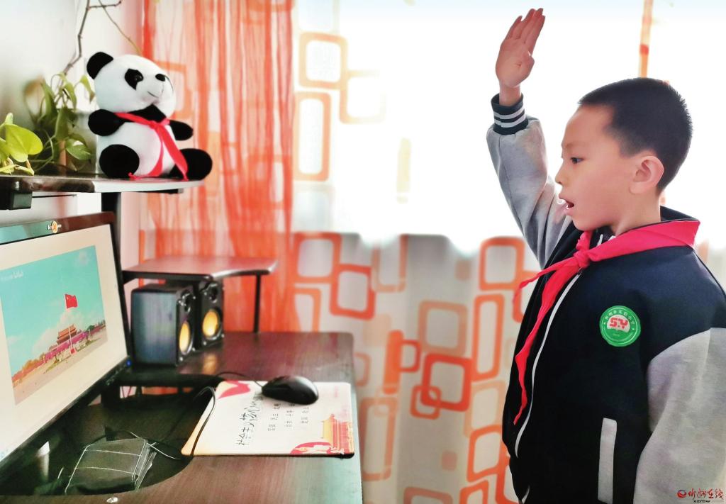 市實(shí)驗(yàn)小學(xué)學(xué)生在家里準(zhǔn)時(shí)參加學(xué)校組織線上升國(guó)旗儀式