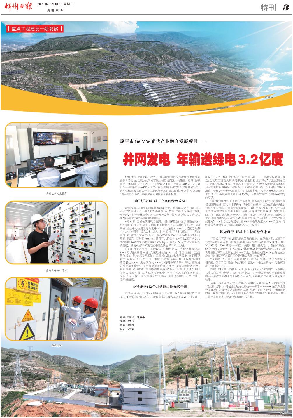 “項(xiàng)目攻堅(jiān)階段,正值原平氣候多變,雨多霧大的時(shí)節(jié),為保障目標(biāo)任務(wù)圓滿完成,團(tuán)隊(duì)以時(shí)不我待、只爭(zhēng)朝夕的勁頭,全力克服山高路險(xiǎn)、地勢(shì)不平的困難,在保障安全的前提下,緊盯節(jié)點(diǎn),倒排工期,積極推進(jìn)光伏片運(yùn)輸安裝等關(guān)鍵工作,為項(xiàng)目全容量并網(wǎng)爭(zhēng)取到了寶貴的時(shí)間。”項(xiàng)目部負(fù)責(zé)人楊亞賽介紹。項(xiàng)目團(tuán)隊(duì)運(yùn)用無(wú)人機(jī)巡檢、智能監(jiān)控平臺(tái),實(shí)時(shí)掌控場(chǎng)區(qū)動(dòng)態(tài)。2025年盛夏來(lái)臨,這里的荒山已變身“藍(lán)色能源?!?。58個(gè)光伏方陣通過(guò)6回35kV集電線路匯入220kV升壓站,再經(jīng)輸送線直供經(jīng)濟(jì)開(kāi)發(fā)區(qū),年輸送綠電3.2億度。