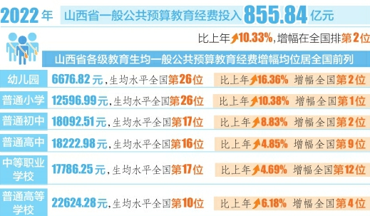 從具體投入領(lǐng)域看,2022年山西省各級(jí)教育生均一般公共預(yù)算教育經(jīng)費(fèi)增幅均位居全國(guó)前列。具體為:山西省幼兒園為6676.82元,生均水平全國(guó)第26位,比上年增長(zhǎng)16.36%,增幅全國(guó)第2位;普通小學(xué)為12596.99元,生均水平全國(guó)第26位,比上年增長(zhǎng)10.38%,增幅全國(guó)第1位;普通初中為18092.51元,生均水平全國(guó)第17位,比上年增長(zhǎng)8.83%,增幅全國(guó)第2位;普通高中為18222.98元,生均水平全國(guó)第16位,比上年增長(zhǎng)4.85%,增幅全國(guó)第9位;中等職業(yè)學(xué)校為17786.25元,生均水平全國(guó)第17位,比上年增長(zhǎng)4.69%,增幅全國(guó)第12位;普通高等學(xué)校為22624.28元,生均水平全國(guó)第10位,比上年增長(zhǎng)6.18%,增幅全國(guó)第4位。