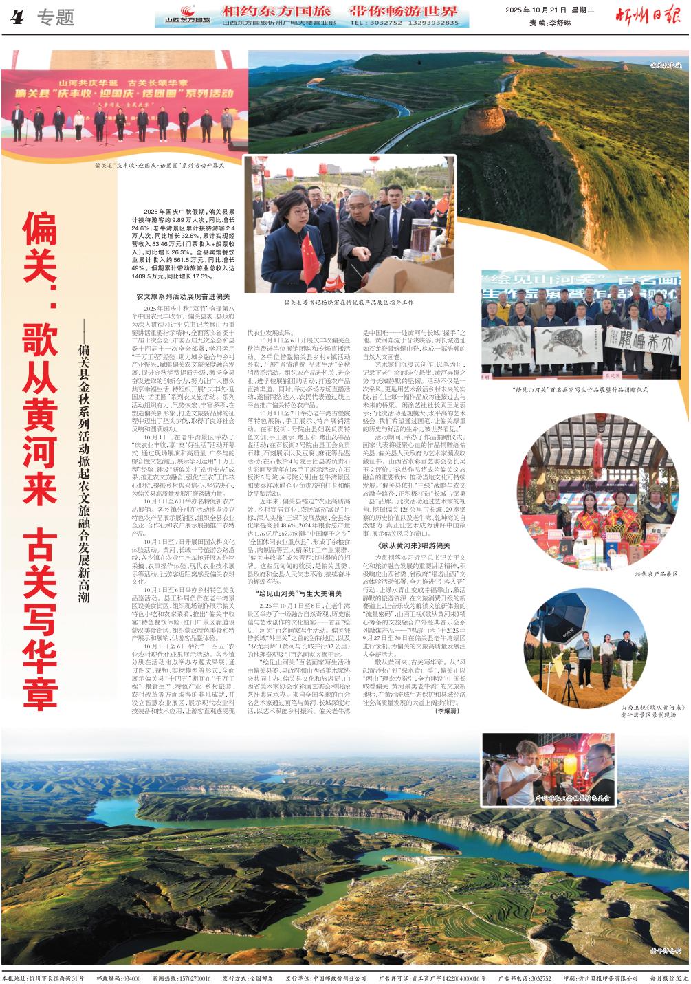 2025年國慶中秋“雙節(jié)”恰逢第八個中國農(nóng)民豐收節(jié),偏關(guān)縣委、縣政府為深入貫徹習(xí)近平總書記考察山西重要講話重要指示精神,全面落實省委十二屆十次全會、市委五屆九次全會和縣委十四屆十一次全會部署,學(xué)習(xí)運用“千萬工程”經(jīng)驗,助力城鄉(xiāng)融合與鄉(xiāng)村產(chǎn)業(yè)振興,賦能偏關(guān)農(nóng)文旅深度融合發(fā)展,促進(jìn)金秋消費提質(zhì)升級,激揚(yáng)全縣奮發(fā)進(jìn)取的創(chuàng)新合力,努力讓廣大群眾共享幸福生活,特組織開展“慶豐收·迎國慶·話團(tuán)圓”系列農(nóng)文旅活動。系列活動組織有力、氣勢恢宏、豐富多彩,在塑造偏關(guān)新形象、打造文旅新品牌的征程中邁出了堅實步伐,取得了良好社會反響和圓滿成功。