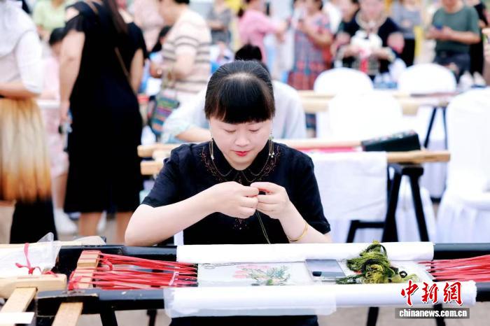 5月29日,第三屆“金針杯”中國刺繡技藝交流活動在四川成都郫都區(qū)舉行,現(xiàn)場蜀繡從業(yè)者展示刺繡技藝。(郫都區(qū)融媒體中心供圖) 正值世運會在蜀地舉辦,蜀繡“彩蛋”隨處可見。如開幕式上,引導(dǎo)牌以竹編為基,銀花絲勾芙蓉花型,蜀繡與漆藝共同“繪就”會徽及參賽國家和地區(qū)名稱;引導(dǎo)員旗袍以蜀繡繡出圖案,與下擺芙蓉花相映。 而在3厘米寬的成都世運會獎牌綬帶上繡微縮會徽,堪稱“針尖芭蕾”。領(lǐng)銜繡師魯莉團隊先將底料緊繃于繡架,確保繡面平整如砥。繡制時,繡娘的指尖得像“長了眼睛”,發(fā)絲粗細的絲線在方寸之間游走。為保證圖案邊緣平滑,她們特意用“藏針”技巧,起針從紋樣邊緣內(nèi)穿出,收針藏于線跡之下。顏色過渡處更是考驗功夫,要計算好每一針摻入的顏色,嚴格控制在1-8針的范圍內(nèi)換色,實現(xiàn)自然過渡。 以色列蹦床運動員羅特姆·阿米海(Rotem Amihai)接過獎牌時,聽志愿者介紹這是中國蜀繡后,觸碰綬帶邊緣的指尖放慢了動作?!八念伾岷陀滞钢α?,原來小小的絲線能創(chuàng)作這樣的藝術(shù)?!彼p晃獎牌感嘆,這一織物承載著中國手工藝人的心意,“它很柔軟,卻把不同國家的人連在了一起。”