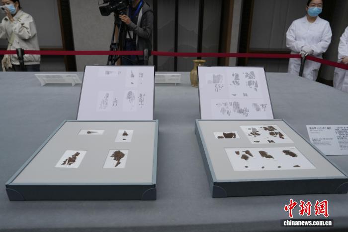 10月13日,流失海外79載的長沙子彈庫戰(zhàn)國帛書第二、三卷《五行令》與《攻守占》正式入藏湖南省博物館。圖為楚帛書《五行令》殘片。中新社記者 楊華峰 攝