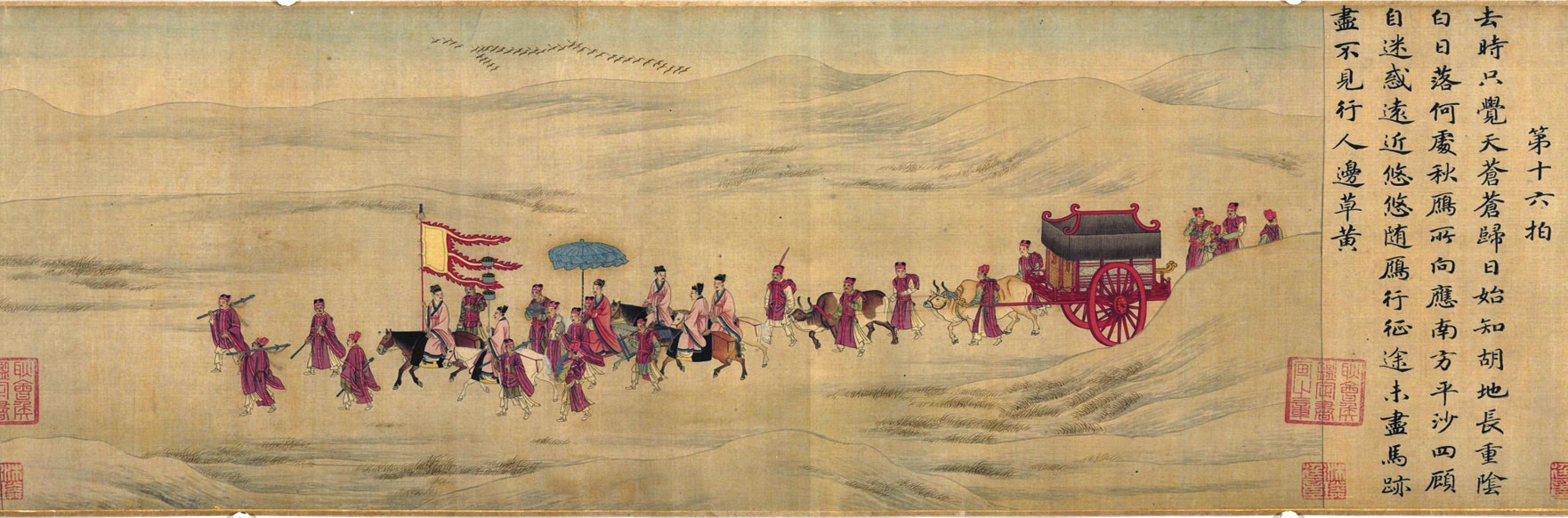 通過(guò)出土和存世的一些圖像,我們可以一窺漢代旄節(jié)之真容。洛陽(yáng)燒溝61號(hào)西漢壁畫墓中的壁畫磚上繪有一持節(jié)使者;山東嘉祥武氏祠一組畫像中,描繪了漢使持節(jié)拜見王陵之母的場(chǎng)景,手中所持之節(jié)正是旄三重,只是看起來(lái)柄長(zhǎng)不到八尺。至于“旄節(jié)之制”,漢代與先秦當(dāng)是有別的,將旄牛尾編成三重流蘇的制節(jié)之法始于漢,《事物紀(jì)原》載:“漢人有持節(jié),乃古旄也。然則節(jié)自周始,而旄節(jié)則起于漢也?!边@種持節(jié)使的形象,在南宋人所繪《胡笳十八拍》和《迎鑾圖》等表現(xiàn)外交題材的畫作中,仍有清晰體現(xiàn),可見這種持節(jié)出使的制度在古代一直延續(xù)。