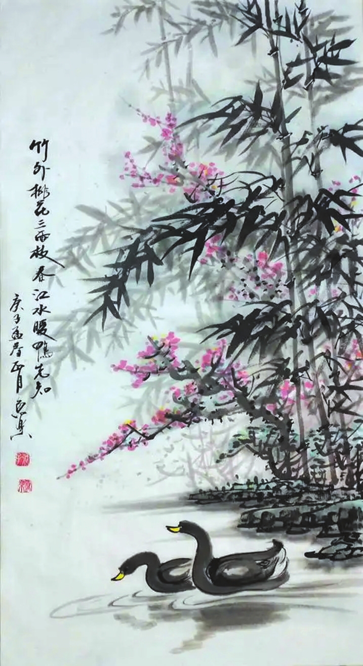 數(shù)字點(diǎn)染,精妙難言。古詩中常用數(shù)字實(shí)寫事物,前呼后應(yīng)形成點(diǎn)染。蘇軾《惠崇春江晚景》中寫“竹外桃花三兩枝,春江水暖鴨先知”,先以“三兩枝”具體描寫桃花零星開放的實(shí)景,渲染初春的環(huán)境氣氛,再以“春江水暖鴨先知”點(diǎn)明題旨。“三兩枝”不多不少恰到好處,點(diǎn)出初春的景物特征——少則春寒料峭,過于冷寂,多則春意盎然,稍嫌熱鬧,都無法與后文“春江水暖鴨先知”對季候變化的感悟相呼應(yīng)。葉紹翁的《游園不值》云“春色滿園關(guān)不住,一枝紅杏出墻來”,先點(diǎn)出“春色滿園”的主旨,再以“一枝紅杏”具體渲染春天壓抑不住的蓬勃生機(jī),以及作者游園不成忽見“春色”破墻溢出的驚喜。這個(gè)“一”是其余數(shù)字替代不了的,數(shù)字點(diǎn)染,準(zhǔn)確精當(dāng),妙不可言。