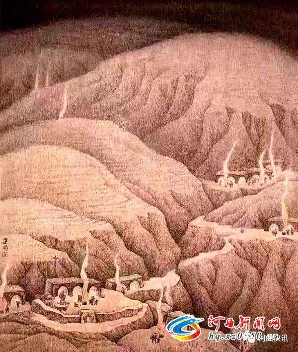 你看,窯洞前沖天的火柱,歡騰的男男女女,老老少少……一切都是如夢(mèng)、如幻、溫馨、細(xì)膩、生機(jī)勃勃而又那么單純、自然……作品精工寫實(shí),整體上卻又有圖案化的簡(jiǎn)潔,大塊面的融入無(wú)邊黑夜的“塬”占據(jù)畫面的主體,形成一種渾厚、蒼茫的氣氛,象征著一種太古和永恒,而點(diǎn)綴其間的嫋嫋升騰的除夕旺火又使這蒼茫的古“塬”富有生機(jī)。