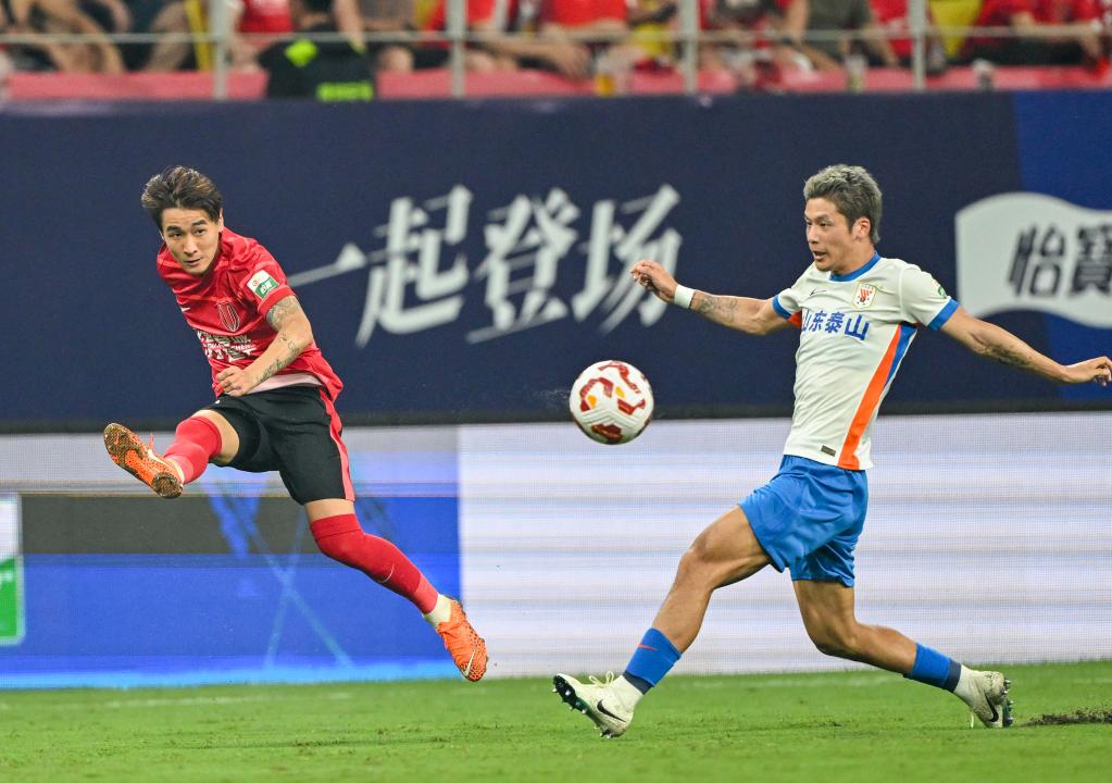 8月2日,成都蓉城隊(duì)球員韋世豪(左)在比賽中射門。新華社發(fā)(尹鋼攝)