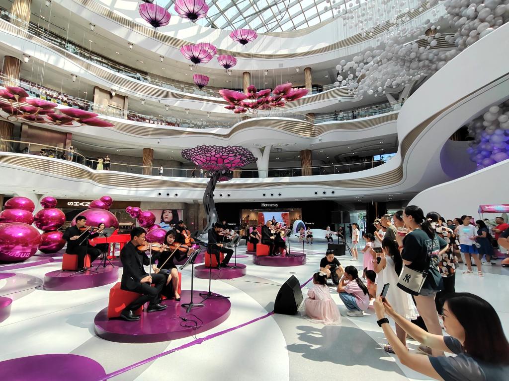 端午假期,??趪H免稅城內(nèi),伴隨著悠揚(yáng)的音樂,陽光傾瀉“天際秘林”夢幻舞臺,正在購物的游客們紛紛駐足欣賞?!耙粓鍪覂?nèi)音樂會,給購物消費(fèi)增添了新意和氛圍感?!焙?谑忻耜惱俪两陉柟夂鸵魳分?。