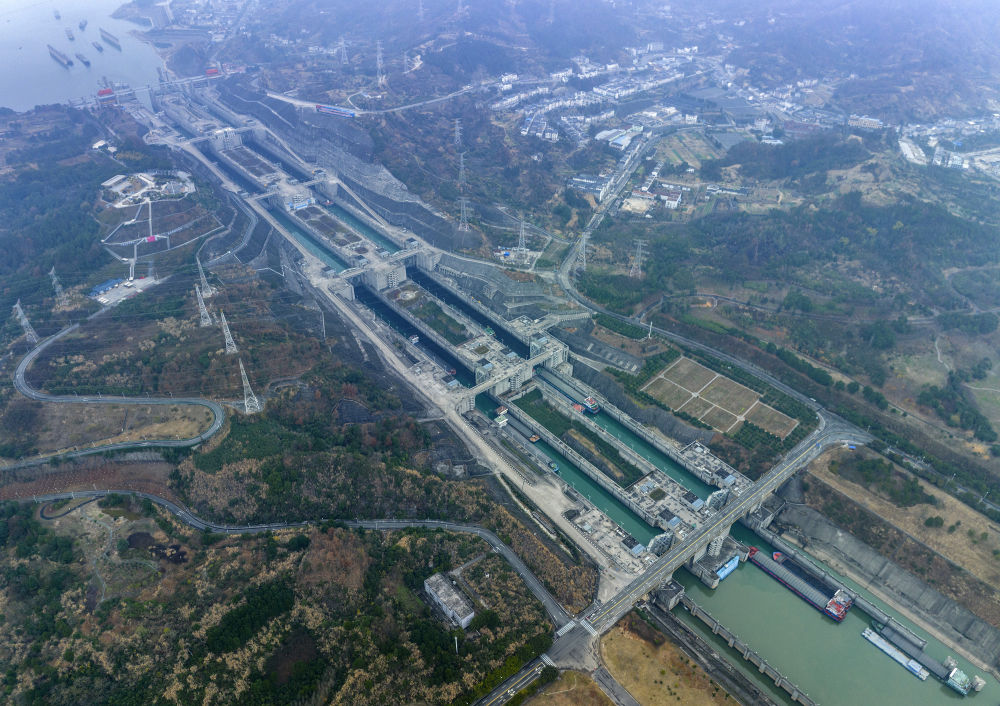 在湖北省宜昌市,船舶有序通過三峽樞紐五級船閘(2023年1月2日攝,無人機(jī)照片)。新華社發(fā)(王罡 攝)